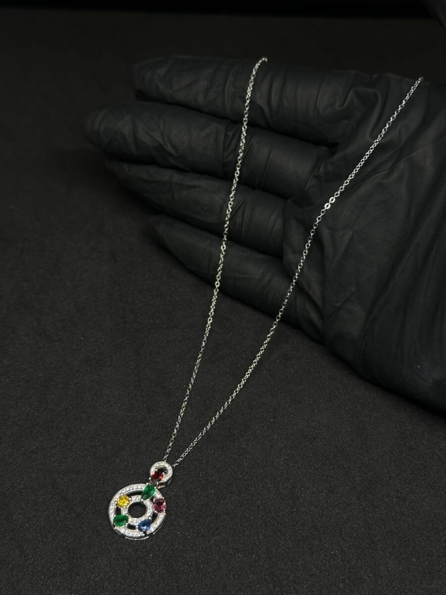 The pendant showcases a stunning interplay of carefully selected gemstones that capture light beautifully to create a dazzling effect. Each stone is expertly hand-set, ensuring precision and quality craftsmanship. From deep-colored stones to radiant sparkles, every gem adds unique vibrancy and character to the piece. The chain itself complements the pendant seamlessly with a sleek, high-polish finish that enhances the overall look.