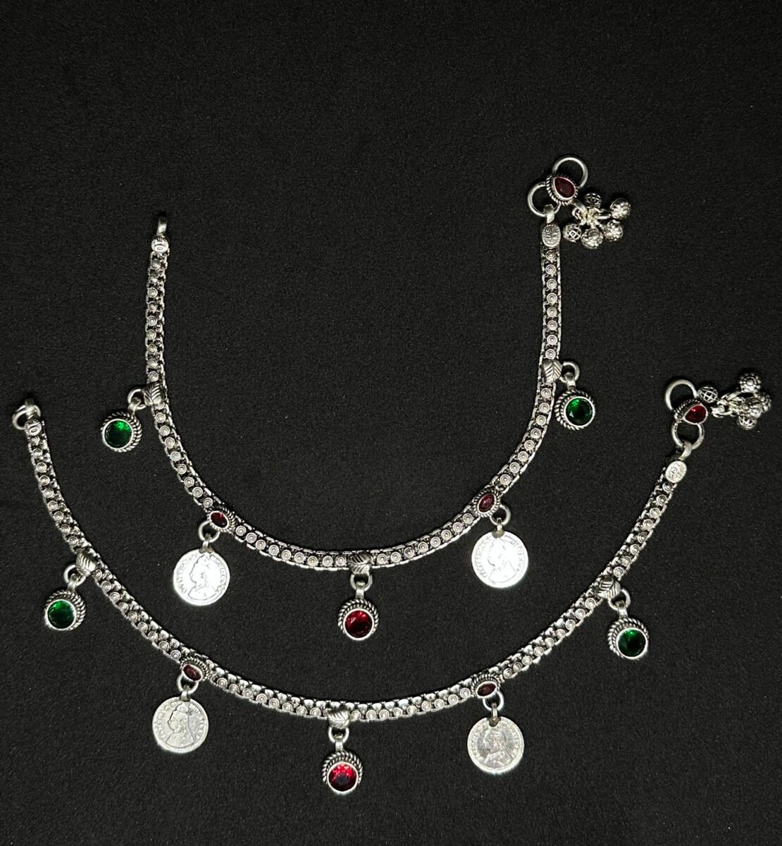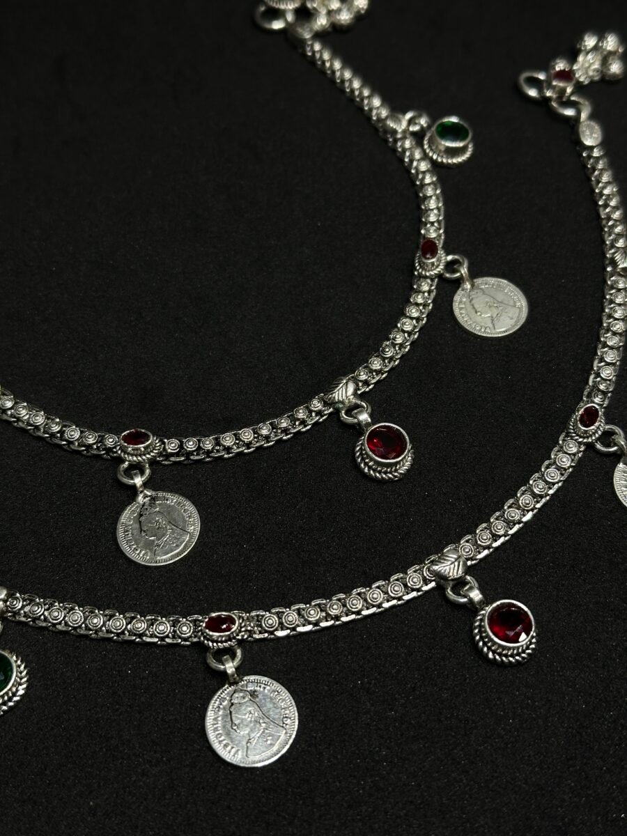 Each payal is meticulously designed with attention to detail, emphasizing its exquisite artistry. The vibrant red and green stones add a regal charm, complementing traditional and modern outfits effortlessly. Whether you’re looking for a standout accessory for weddings, festive occasions, or evenings of grandeur, this luxurious set is your perfect companion. The Queen Gini-inspired design evokes an aura of royalty, making it a versatile yet stunning jewel to own.